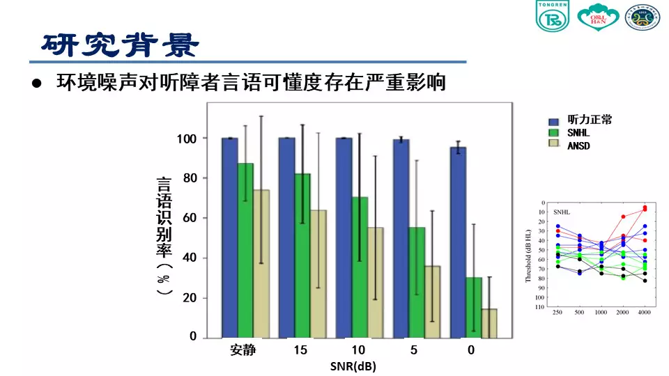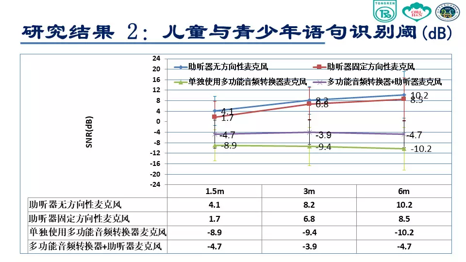 <br /><br /><br />環(huán)境噪聲對聽障者言語可懂度存在嚴(yán)重影響<br /><img src="/upfiles/201807200933345194.jpg" alt="" /><br />(感音神經(jīng)性聾患者聽力圖)<br /><br /><br />在有噪聲的環(huán)境里,特別對于感音神經(jīng)性聾患者來說非常困難,言語清晰度和可懂度會存在嚴(yán)重障礙。<br />在安靜環(huán)境或者信噪比為零的環(huán)境下,聽力正常人的表現(xiàn)基本接近 100%,說明聽力正常者的聽覺功能、抗噪功能是正常的。上圖綠色柱狀圖表示,伴隨著環(huán)境噪聲的增大,言語識別率遞減。<br /><br /><br /></span><p><span style="font-size:14px;">隨著與聲源距離的增加,強度迅速衰減,信噪比逐漸下降</span></p><p><span style="font-size:14px;"><img src="/upfiles/201807200933155202.jpg" alt="" /><br /></span></p><span style="font-size:14px;">已經(jīng)實現(xiàn)的助聽輔助技術(shù)<br /><br /><br />FM 系統(tǒng)<br /><br /><br />數(shù)字無線配件:發(fā)射器、接收機數(shù)字信號傳輸<br /><br /><br />研究目的<br />本項課題主要是研究使用無線麥克風(fēng)系統(tǒng)對聽障患者在噪聲條件下和遠(yuǎn)距離環(huán)境下對言語識別能力改善的效果。<br /><br /><br />研究方法<br /><br /><br /><br /><br />助聽設(shè)備<br /><img src="/upfiles/201807200932488824.jpg" alt="" /><br /><br />測試材料<br /><br /><br /><br /><br />漢語普通話版噪聲下言語測試材料(Mandarin Hearing in Noise Test, MHINT)<br /><br /><br />成人測試材料<br /><br /><br />兒童測試材料<br /><br /><br />言語刺激聲<br /><br /><br />言語刺激聲分別來自受試者1.5m,3m和6m處<br /><br /><br />采用自適應(yīng)的步驟來測試噪聲中的語句識別閾<br /><br /><br />環(huán)境噪聲<br /><br /><br />采用與測試材料本身頻譜接近的言語譜噪聲 (SSN)<br /><br /><br />噪聲強度為65 dB(A)<br /><br /><br /><br /><br />測試環(huán)境<br /><img src="/upfiles/201807200931496282.jpg" alt="" /><br /><br />??成人受試者<br /><img src="/upfiles/201807200931377495.jpg" alt="" /><br /><br />??程序設(shè)置<br /><br /><br />單獨使用助聽器麥克風(fēng)(HA Mic Only):固定方向性<br /><br /><br />單獨使用迷你麥克風(fēng)(Micro Mic Only)<br /><br /><br />同時使用助聽器麥克風(fēng)和迷你麥克風(fēng)(HA Mic+Micro Mic)<br /><br /><br />受試者距離言語信號揚聲器的距離<br /><br /><br />1.5m<br /><br /><br />3m<br /><br /><br />6m<br /><br /><br />隨機更換各種測試條件<br /><br /><br />兒童和青少年受試者<br /><br /><img src="/upfiles/201807200930455527.jpg" alt="" /><br />?程序設(shè)置<br /><br /><br />C1:單獨使用助聽器麥克風(fēng):全向性<br /><br /><br />C2:單獨使用助聽器麥克風(fēng):固定方向性<br /><br /><br />C3:單獨使用迷你麥克風(fēng)<br /><br /><br />C4:同時使用助聽器麥克風(fēng)和迷你麥克風(fēng)<br /><br /><br />受試者距離言語信號揚聲器的距離<br /><br /><br />S1:1.5m<br /><br /><br />S2:3m<br /><br /><br />S3:6m<br /><br /><br />隨機更換各種測試條件<br /><br /><br />統(tǒng)計學(xué)分析<br /><br /><br />采用雙因素方差分析判斷受試者噪聲條件下言語識別閾是否受距離和程序設(shè)置的影響<br /><br /><br />分析距離對程序設(shè)置各水平的影響<br /><br /><br />分析程序設(shè)置對距離各水平的影響<br />研究結(jié)果<br />成人語句識別閾<br /><img src="/upfiles/201807200929474048.jpg" alt="" /><br /><br />?上圖中,藍(lán)色曲線表示助聽器麥克風(fēng)打開的情況;綠色表示助聽器和迷你麥克風(fēng)同時打開;紅色表示僅打開迷你麥克風(fēng)。<br /><br /><br />我們可以看到,單獨使用助聽器麥克風(fēng)情況下,言語識別閾從1.5m處的5.55 dB上升到6m處的13.11 dB。單獨使用迷你麥克風(fēng)和使用迷你麥克風(fēng)同時開啟助聽器麥克風(fēng)這兩種情況下受試者言語識別閾隨距離變化不大。<br /><br /><br />在1.5m處單獨使用迷你麥克風(fēng)比單獨使用助聽器麥克風(fēng)信噪比可以獲得11dB的改善,同時這種改善會隨著距離的增加效果越來越明顯,在6m處可到20.6 dB。<br /><br /><br />兒童與青少年語句識別閾<br /><img src="/upfiles/201807200929214754.jpg" alt="" /><br /><br />??方向性麥克風(fēng)的使用,隨著距離的增加,言語識別閾沒有明顯改善。<br />結(jié)論<br />單獨使用助聽器麥克風(fēng)(全向性或方向性),伴隨距離增加,言語識別能力會顯著下降;<br /></span><p><span style="font-size:14px;">使用無線麥克風(fēng)系統(tǒng),言語識別能力不隨距離的改變而發(fā)生顯著改變,即可以顯著改善遠(yuǎn)距離噪聲環(huán)境下言語識別能力。(內(nèi)容來源網(wǎng)絡(luò))</span></p><p><span style="font-size:14px;">聽覺有道助聽器品牌:http://www.xhfkj.cn/</span></p>" />