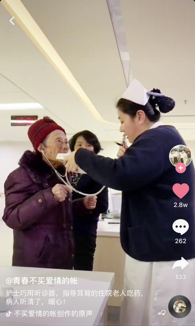 <span style="white-space:pre"> </span>“一天吃幾個呀?”<br /><br /> “一天三次,一次兩顆!”<br /><br /> “哦,一天三次,哦哦?!?lt;br /><br /> 短短的三句話,15秒。<br /><br /> 一條護士用聽診器當“臨時助聽器”,為一位耳背老奶奶講解用藥方法的抖音視頻在網上熱傳。<br /><br /> 視頻中的老奶奶是住在醫院的79歲老人,有點耳背,用聽診器說話的是護士黃艷,拍攝者是另一位護士蔣夢婷。當時,老奶奶不知怎么吃藥,小黃喊了半天,奶奶也沒聽清,于是靈機一動,就把聽診器用上了。一旁的小蔣順手就把視頻分享到微信朋友圈里。<br /><br /> 友好醫院工作人員把這段視頻做成一條抖音視頻,以網名“青春不買愛情的帳”發送?!扒啻翰毁I愛情的帳”說,本來就想與同事和朋友分享一下醫院護士既機智又暖心的行為,沒想到僅一天的工夫,竟獲百萬點擊量,數萬個贊。<br /><br /> “看到節節飆升的點擊量,我非常激動?!薄扒啻翰毁I愛情的帳”說,可以看出人們對醫護人員這個行業的關注。<br /><br /> “我們對老人一個小小的關愛行為,竟引起網友的強烈反響,可以看到我們社會充滿愛?!?lt;br /><br /> 除了熱情點贊,還有不少網友發表了評論。<br /><br /> “給這個職業的工作者點贊,她們的真的很偉大,也很不容易?!?lt;br /><br /> “最美護士!”<br /><br /> “太贊了,真是暖心一幕。”<br /><br /> “這個職業工作者不容易,為這個護士姐姐點贊?!?lt;br /><br /> 還有的網友打趣,表示學到了一招:“太有才了,聽診器開發出新用途。”<br /><br /></span><p><span style="font-size:16px;"> “對這個可以。心臟不好的聽心臟;肺不好了聽肺;嗓子不好了,可以當喇叭使;耳朵不好了可以當助聽器?!?lt;/span></p><p style="text-align: center;"><span style="font-size:16px;"><img src="/upfiles/201907240350126074.jpg" alt="" /><br /></span></p>" />
