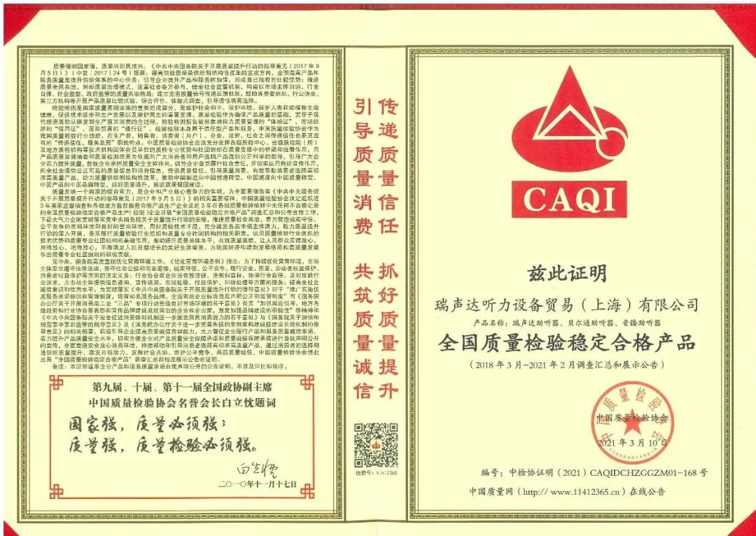 作為對貝爾通助聽器產品質量和服務的肯定,2021年中國質量檢驗協會再次向貝爾通助聽器頒發了三項榮譽證書,以期能引導用戶選擇高標準高質量的產品,傳遞質量信任,優化消費環境。