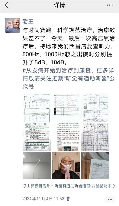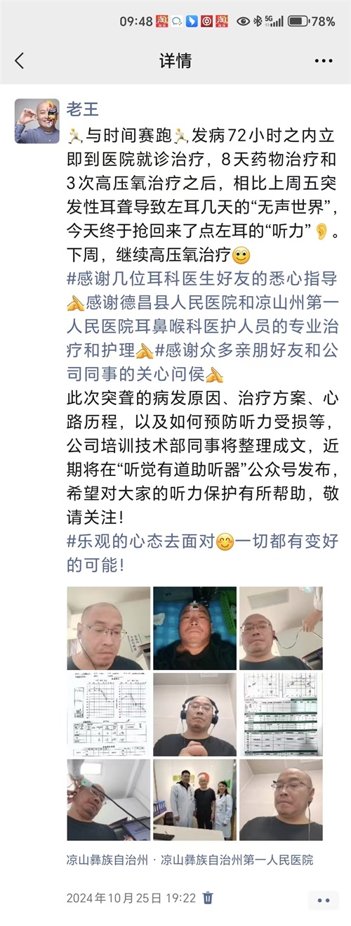 在這個快節奏的世界里,每一個細微的聲音都承載著生活的溫度。然而,突如其來的聽力挑戰,卻讓這份美好變得模糊。<br /><br /><br />聽覺有道全國聽力連鎖聯合創始人王曉剛先生,期間或因工作過度操勞,于2024年10月16日的夜晚,耳道內突然響起了一聲“砰”的異響。次日,他的耳內又相繼出現了“噗噗”聲、“滋滋”聲的雜音,與人交談時,聽不清、甚至聽不到對方的話語變得愈發顯著。<br /><br /></span><p><span style="font-size:16px;">以下任何一項癥狀單獨或突發性耳聾的發病原因及發病機制尚不明確,多認為與病毒感染、腫瘤性病變、自身免疫疾病、藥物中毒內耳缺血等因素相關。<br />過度勞累,焦慮、精神壓力及相關心理因素等被認為是常見的誘發因素。伴隨出現,均有可能是突發性聾:<br />1、突然發生的主觀聽力下降(但是根據聽力損失的程度以及頻率不同,不是所有的病人都有聽力下降的感覺)<br /><br /><br />2、耳鳴(約90%)<br /><br /><br />3、耳悶脹感(50%以上)<br /><br /><br />4、眩暈、惡心、嘔吐(30%~50%)<br /><br /><br />5、聽覺過敏或重振(表現為對聲音異常敏感或者異常遲鈍,導致刺耳感或者失真感)<br /><br /><br />6、耳周感覺異常:(如麻木感、針刺感等不適感覺(全聾患者常見))<br /></span></p><p><span style="font-size:16px;">18日下午,當他嘗試堵住右耳,竟發現左耳幾乎無法捕捉到外界的任何聲響。此刻,王總深刻意識到,自己的聽力出現了嚴重問題,于是立即趕往當地醫院耳鼻喉科進行檢查,最終被確診為突發性耳聾。</span></p><p><br /></p><p style="text-align: center;"><img src="/upfiles/202411140426063076.jpg" alt="" /><br /></p><p><br /></p><p><span style="font-size:16px;">回想起發病初期,王總表示,當自己突然失去聽力,完全與外界隔絕的那一刻,內心充滿了無助與恐懼。幸運的是,由于他長期深耕聽力行業,對聽力受損有著較為深入的了解、明白:突聾聽力救治時間為黃金72小時內。因此能夠識別癥狀并及時就醫,從而得到了有效的治療。<br /><br /><br />然而,如今仍有許多患者對聽力健康的信息了解不足,錯過了最佳的治療時機,最終形成不可逆的聽力損傷,給日常生活、工作中帶來嚴重交流障礙。</span><br /></p><p><br /></p><p style="text-align: center;"><img src="/upfiles/202411140428078193.jpg" alt="" /><br /></p><p style="text-align: center;"><img src="/upfiles/202411140429087669.jpg" alt="" /><br /></p><p style="text-align: center;"><img src="/upfiles/202411140429178890.png" alt="" /><br /></p><p style="text-align: center;"><br /></p><p style="text-align: center;"><span style="font-size:16px;color:#ff9900;"><strong>什么是突發性耳聾?</strong></span></p><p style="text-align: center;"></p><div style="text-align: left;"><span style="font-size:16px;">醫學全名:突發性不明原因性聽力損失。</span></div><span style="font-size:16px;"></span><div style="text-align: left;"><br /></div><div style="text-align: left;"><br /></div><div style="text-align: left;">簡稱:突聾</div><div style="text-align: left;"><br /></div><div style="text-align: left;"><br /></div><div style="text-align: left;">根據中國2015年版《突發性聾診斷和治療指南》,突發性耳聾目前定義為:是指72小時內突然發生、原因不明的感音神經性聽力損失,至少在相鄰的兩個頻率聽力下降≥20dBHL。</div><div style="text-align: left;"><br /></div><div style="text-align: left;"><br /></div><div style="text-align: left;">近年來“突發性耳聾”患者年輕化趨勢明顯,年輕人患病比例增加了三至四成。耳蝸中的聽覺毛細胞一旦受損,在一定時間內得不到及時治療,將不能再生。</div><div style="text-align: left;"><br /></div><div style="text-align: left;"><br /></div><div style="text-align: center;"><strong><span style="color:#ff9900;">臨床表現</span></strong></div><p></p><p><span style="font-size:16px;">突聾一般單側發病,個別情況下可以雙側發病( 1/10雙側);</span><br /></p><p><span style="font-size:16px;"><br /></span></p><p style="text-align: center;"><span style="font-size:16px;color:#ff9900;"><strong>原發狀態</strong></span></p><p><span style="font-size:16px;">以下任何一項癥狀單獨或伴隨出現,均有可能是突發性聾:<br />1、突然發生的主觀聽力下降(但是根據聽力損失的程度以及頻率不同,不是所有的病人都有聽力下降的感覺)<br /><br /><br />2、耳鳴(約90%)<br /><br /><br />3、耳悶脹感(50%以上)<br /><br /><br />4、眩暈、惡心、嘔吐(30%~50%)<br /><br /><br />5、聽覺過敏或重振(表現為對聲音異常敏感或者異常遲鈍,導致刺耳感或者失真感)<br /><br /><br />6、耳周感覺異常:(如麻木感、針刺感等不適感覺(全聾患者常見))<br /></span></p><p><span style="font-size:16px;"><br /></span></p><p style="text-align: center;"><span style="font-size:16px;color:#ff9900;"><strong>繼發狀態</strong></span></p><p><span style="font-size:16px;">恐懼,焦慮;耳鳴帶來的心理、睡眠干擾等,嚴重影響生活質量。<br /></span></p><p><span style="font-size:16px;"><br /></span></p><p style="text-align: center;"><span style="font-size:16px;color:#ff9900;"><strong>誘發因素</strong></span></p><p><span style="font-size:16px;">突發性耳聾的發病原因及發病機制尚不明確,多認為與病毒感染、腫瘤性病變、自身免疫疾病、藥物中毒內耳缺血等因素相關。<br />過度勞累,焦慮、精神壓力及相關心理因素等被認為是常見的誘發因素。<br /></span></p><p><span style="font-size:16px;"><br /></span></p><p style="text-align: center;"><span style="font-size:16px;color:#ff9900;"><strong>治療</strong></span></p><p><span style="font-size:16px;">一旦出
