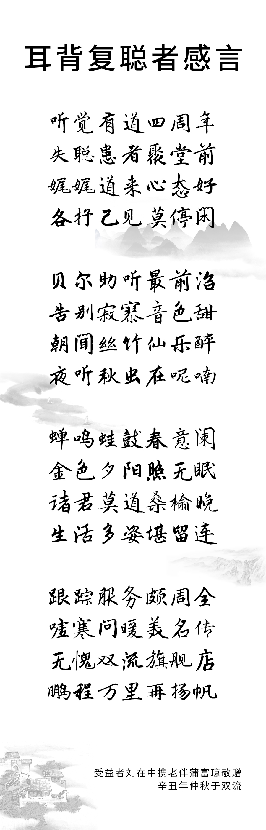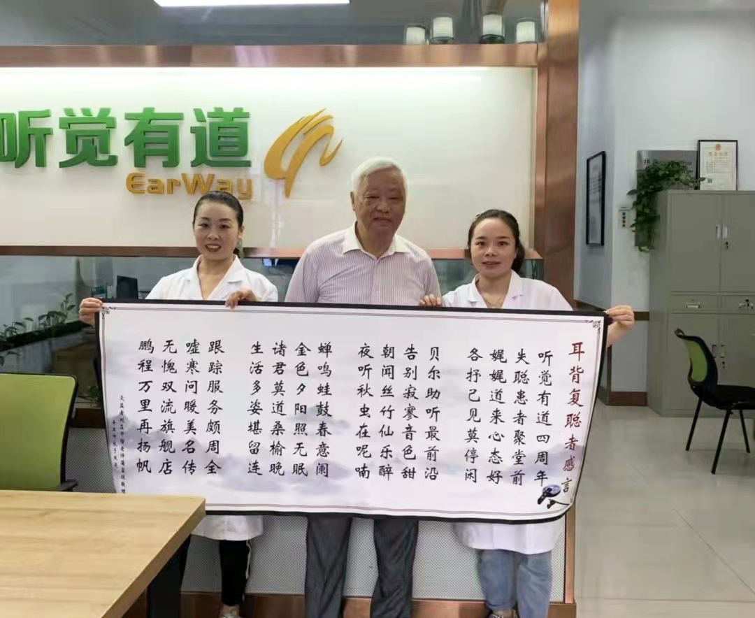 <span style="white-space:pre"> </span>辛丑年仲秋,聽覺有道雙流旗艦店四周年慶將至,劉在中老先生有感而發,作詩一首,以表對驗配師服務工作的認可。<br /><br /> 時逢大雨,劉老冒雨前來贈送字畫,令人感動。<br /><br /> 劉老對貝爾通助聽器給予了極大的評價:“貝爾助聽最前沿,告別寂寥音色甜?!?lt;br /><br /> 講述佩戴助聽器之后的感受,劉老寫道:“朝聞絲竹仙樂醉,夜聽秋蟲在呢喃?!?lt;br /><br /> 對其他聽力不好的老年朋友,劉老詩中勸導:“諸君莫道桑榆晚,生活多姿堪留連?!?lt;br /></span><p><span style="font-size:16px;"> 對聽覺有道雙流旗艦店,劉老更是不吝贊詞:“跟蹤服務頗周全,噓寒問暖美名傳。無愧雙流旗艦店,鵬程萬里再揚帆?!?lt;/span></p><p style="text-align: center;"><span style="font-size:16px;"><img src="/upfiles/202109150412005668.jpg" width="640" alt="" /> <img src="/upfiles/202109150412002603.jpg" width="640" alt="" /> <img src="/upfiles/202109150412001731.jpg" width="640" alt="" /><br /></span></p><p style="text-align: center;"><br /></p>" />